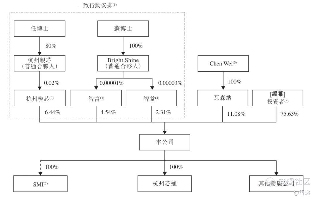 IPO前,任远程博士通过杭州模芯持股为6.44%,苏慧伦博士通过智富持股为4.54%,智益持股为2.31%。任远程博士等一致行动人士共同持有约13.92%股份。此外,Chen Wei持股为11.08%。
