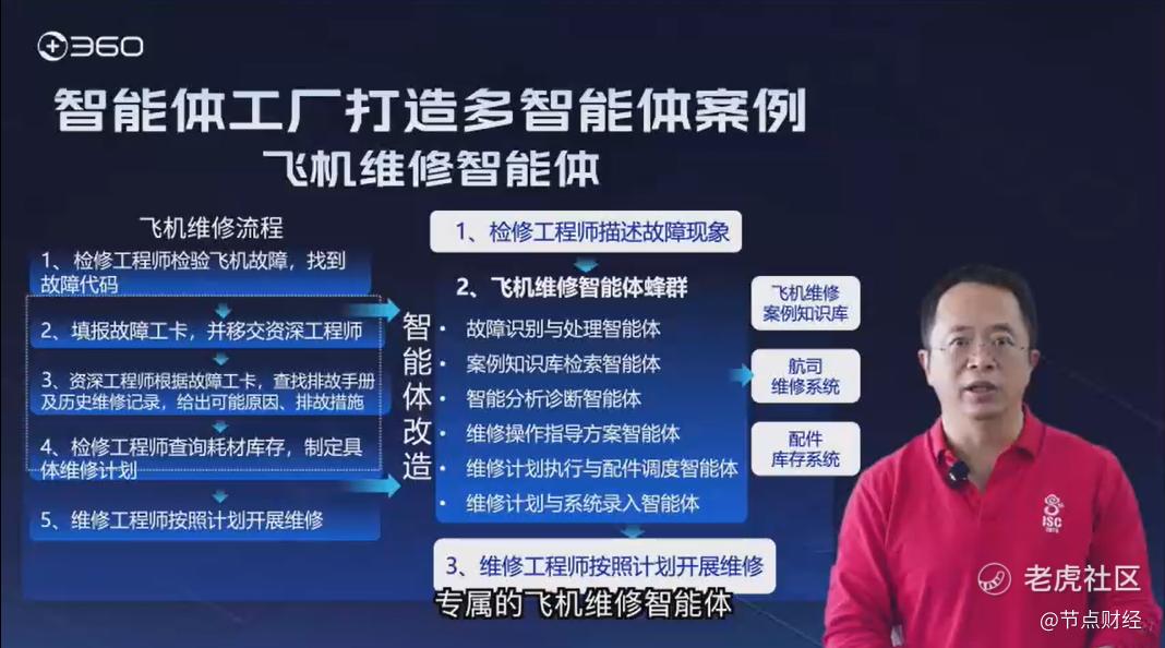 我们通过360智能体工厂给深圳打造了专属的飞机维修智能体。过去,维修一架飞机要历经故障排查、方案制定、耗材查询等五个环节,全程依赖人工,效率低下。引入智能体之后,工程师只要用自然语言描述故障现象,智能体就能自动完成从诊断、方案生成、配件调度到工单录入的全流程。工程师按照生成的明确计划执行维修就可以。