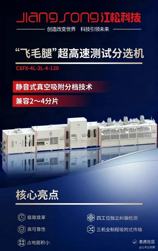 近两年公司技术创新成果显著:2026年1月,正式发布“飞毛腿”超高速测试分选机(CSFX-4L-2L-4-120),集成正背颜色检测、IV/EL/PL检测,支持2-4片同时测试,适配TOPCON/BC工艺的高速分档需求;2025年12月,取得“边框规整装配机构”专利(CN223617605U),通过自动化调整光伏板边框位置,缩短机械节拍提升生产效率;2024年10月,子公司无锡松拓交付二代超大产能光伏电池湿法清洗设备,产能≥18000片/小时,适用于光伏TOPCON、XBC、HJT等电池工艺,尺寸兼容方片、矩形片及半片工艺,降低化学品单耗与能耗,为N型电池大规模量产提供关键设备支撑。