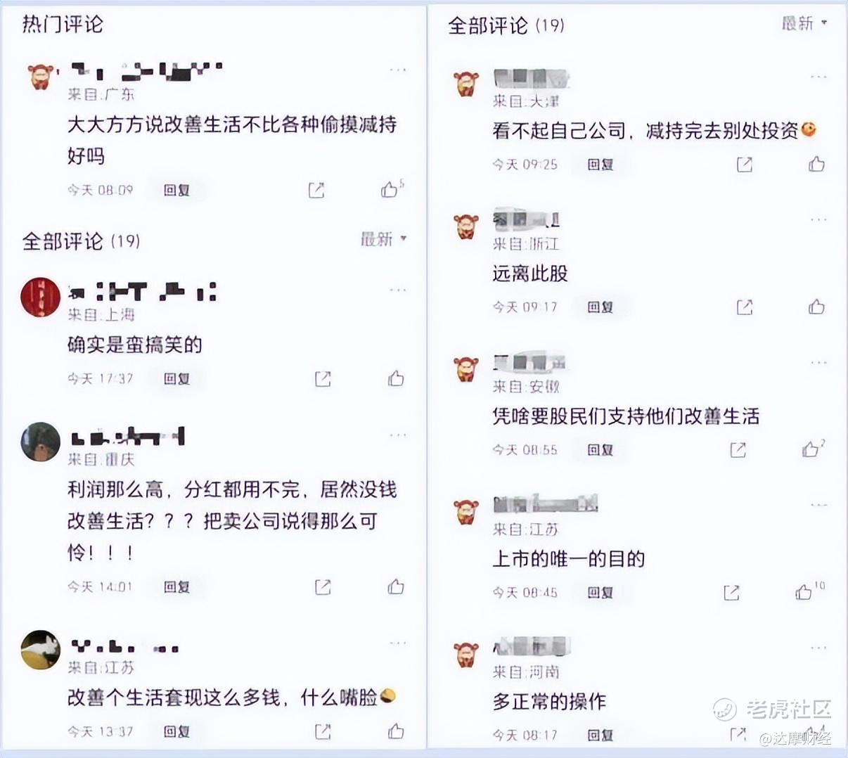 减持公告发布后,很快引来了投资者们的关注。有投资者在其股吧质疑,“分红都用不完,居然没钱改善生活?”“不投资自己公司,减持完去别处投资。”也有投资者对这一行为表示理解,认为股东减持是正常操作。