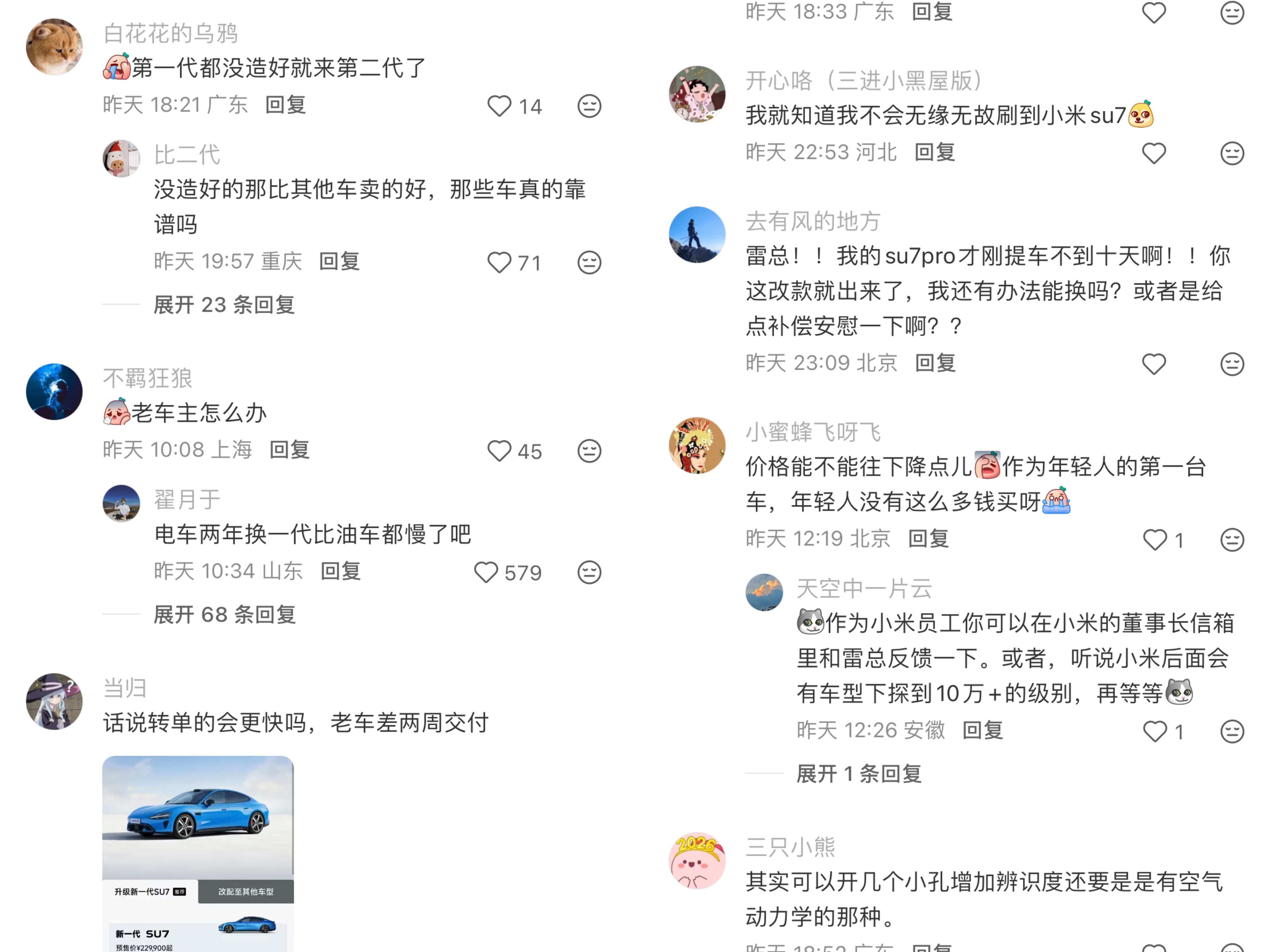 值得关注的是,7号雷军公布了新一代改版SU7开启小订,预计2026年4月上市,SU7新款,预售22.99万起,激光雷达全系标配,续航全面升级,外观内饰有所改动。花旗发表研究报告指出,SU7改款预售将带动小米订单增长,后续催化剂将会是SU7正式上市及YU7 GT推出市场。该行予小米目标价50港元,评级“买入”。评论区似乎并不是很积极:[正经]