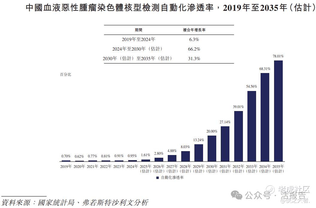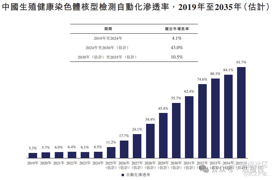 根据弗若斯特沙利文(Frost & Sullivan)的报告,中国生殖健康染色体核型检测的自动化率由2019年的5.3%提升至2024年的6.5%,复合年增长率为4.1%,增速相对平缓。2030年至2035年,自动化进程预计将持续推进,到2035年达到91.7%,尽管此阶段的复合年增长率将放缓至10.5%。