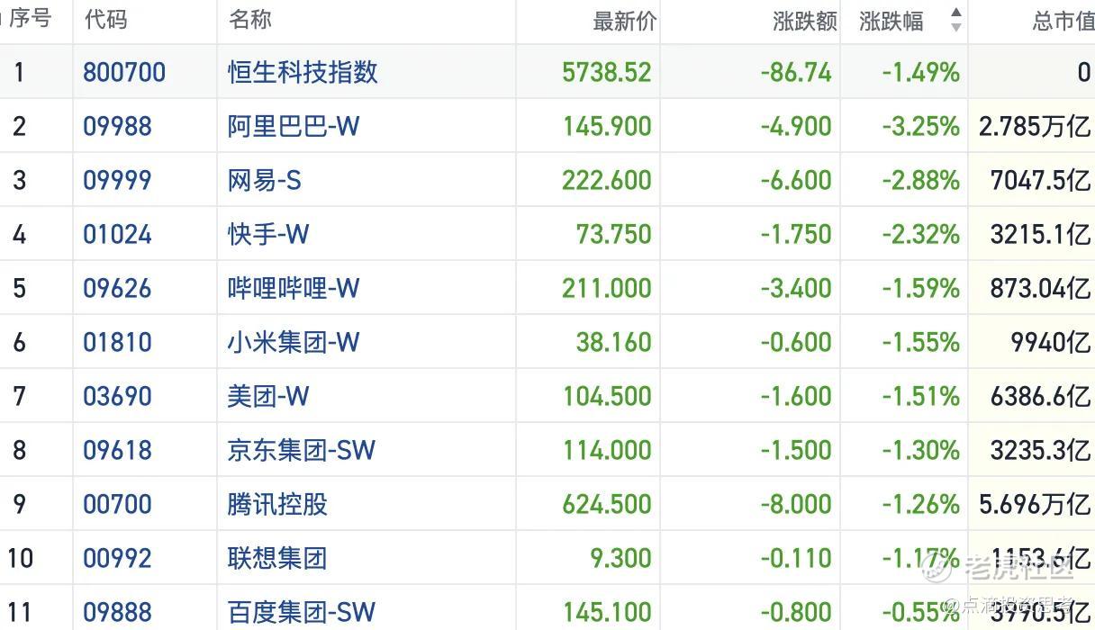 盘面上,今日大型科网股集体下挫拖累大市。阿里巴巴跌超3%,网易、快手跌超2%,美团、小米、腾讯、京东均跌超1%。