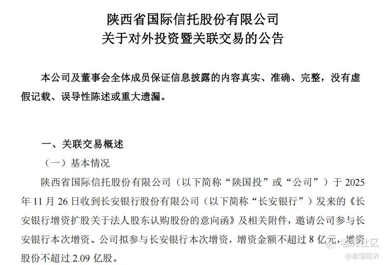 2026年1月5日,陕西省国际信托股份有限公司(下简称“陕国投A”)发布公告:拟以不超过8亿元自有资金,认购长安银行不超过2.09亿股。