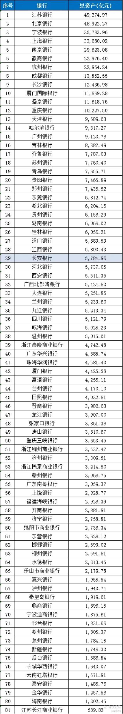 长安银行作为全省唯一的省级法人银行,资产规模5700亿元,远小于同类省份城商行。