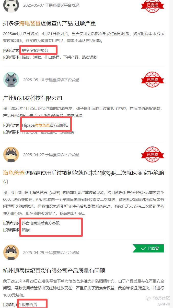 另外,在黑猫投诉平台上,“过敏、产品含有荧光剂”等投诉接连不断,涉及的平台包括但不限于拼多多、抖音、京东、天猫、银泰百货、沃尔玛等线上线下知名销售渠道。一边是“青少年专研”“温和修护”的华丽包装,一边是消费者皮肤受损、维权无门的现实困境。品牌方用精心设计的话术和平台流量玩法,织成一张看似可靠的网,兜住的却是信任的漏洞。