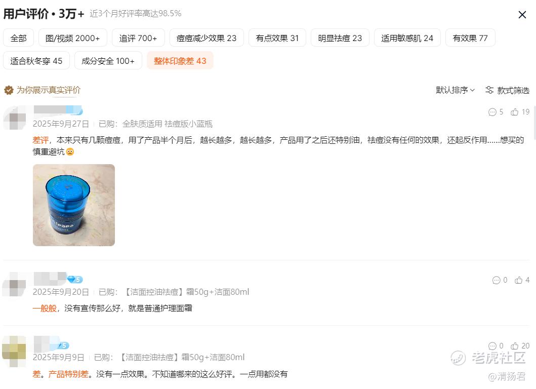 清扬君舆情分析中心在调查过程中还发现,“双萃焕颜修护精华霜”在天猫旗舰店近3个月的好评率虽然有98.5%,但也有不少消费者评论称:“没有一点效果”、“痘痘越长越多”、“用了特别油,起反作用”。甚至有人怀疑他们的好评是怎么来的。