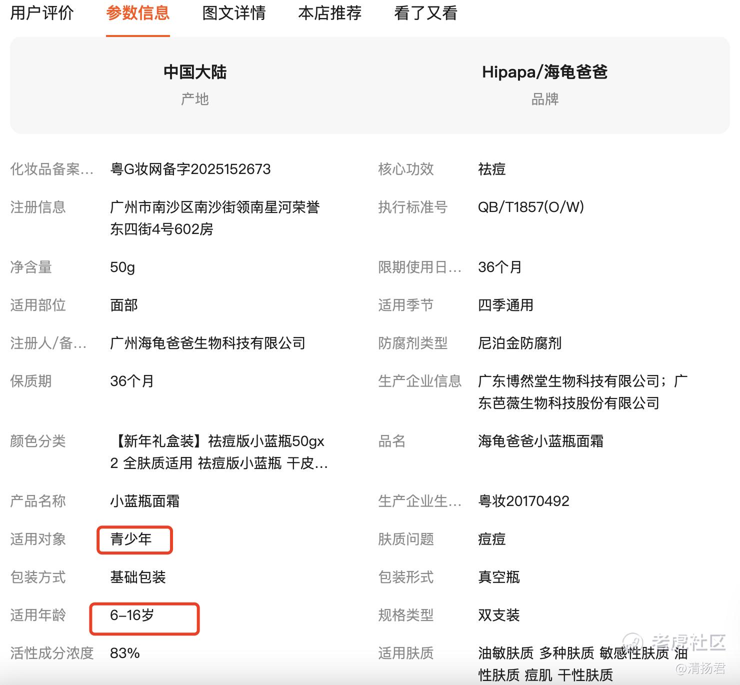 在海龟爸爸天猫旗舰店,“小蓝瓶面霜”页面赫然标注适用年龄“6-16岁”,适用对象为“青少年”。