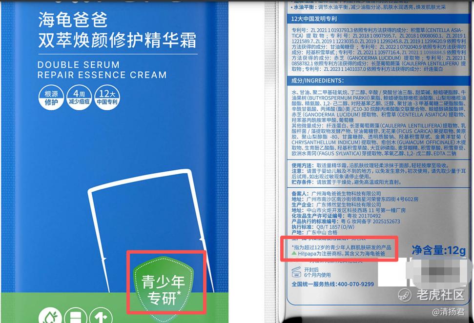 然而,通过国家药监局官网查询其备案编号“粤G妆网备字2025152673”,对应的产品真实名称为“海龟爸爸双萃焕颜修护精华霜”,产品备案主体为广州海龟爸爸生物科技有限公司,使用人群为“普通人群”。但备案产品外包装上宣传的是“青少年专研”,并备注小字“指超12岁的青少年人群肌肤研发的产品”。
