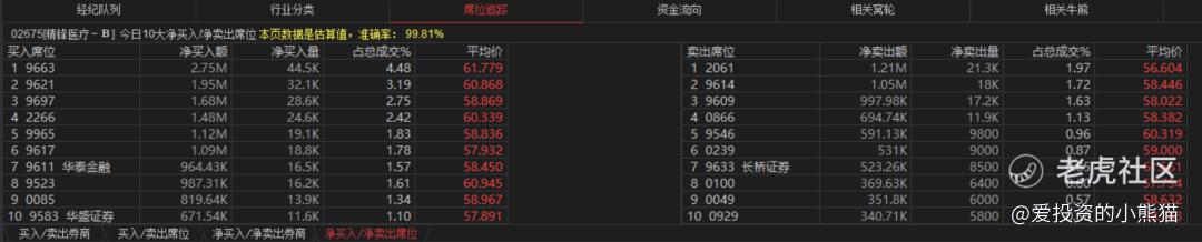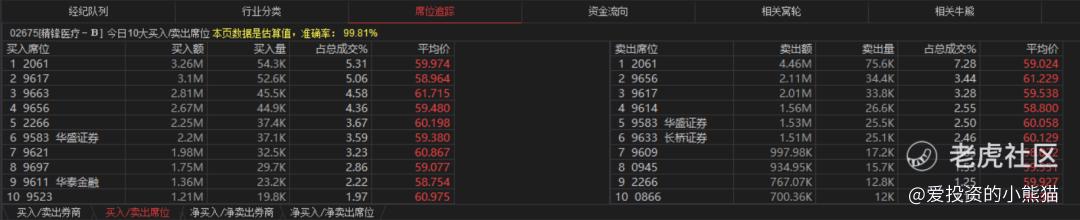 精锋医疗-B(02675.HK)买盘席位有9663、9621、2266、0085等,卖盘第一席位是2061,0866在卖盘第四席位。