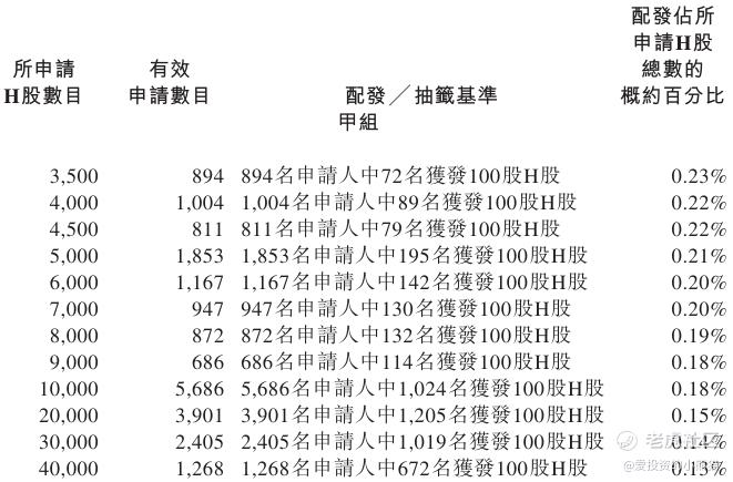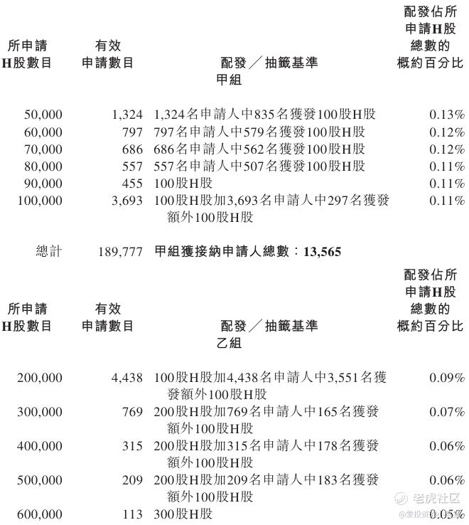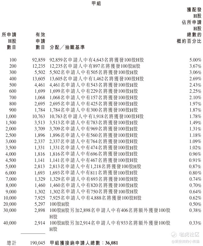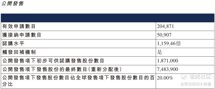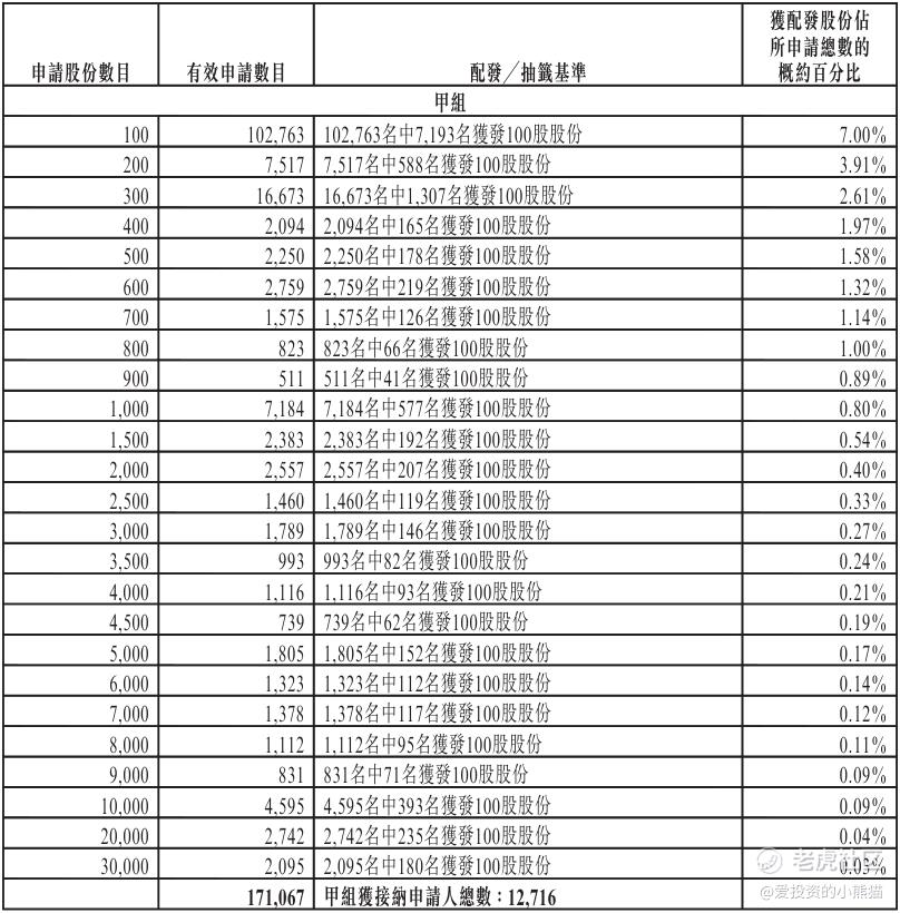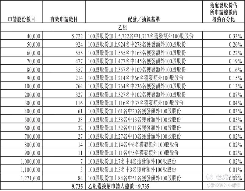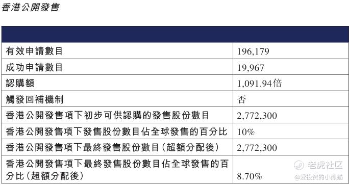 配售情况:196179人认购,这次公配1091.94倍,由于执行分配机制B, 回拨比率无,国配有25.18倍,一手中签率0.50%,认购900手稳中1手,同时乙组6402人申购,其中顶头槌申购285张,获配率0.04%-0.09%。