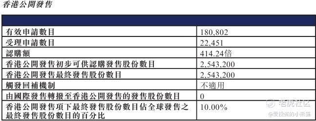 配售情况:180802人认购,这次公配414.24倍,由于执行分配机制B, 回拨比率无,国配有10.68倍,一手中签率7.00%,认购400手稳中1手,同时乙组9735人申购,其中顶头槌申购84张,获配率0.01%-0.33%。