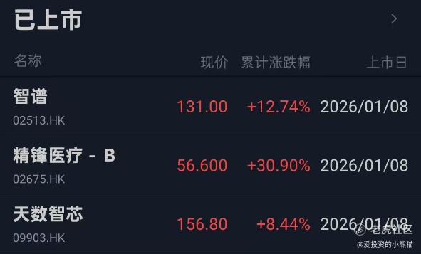 2026年1月8日, $智谱(02513)$ 、 $精锋医疗-B(02675)$ 、 $天数智芯(09903)$ 三只港股新股同日上市,均以红盘收官。