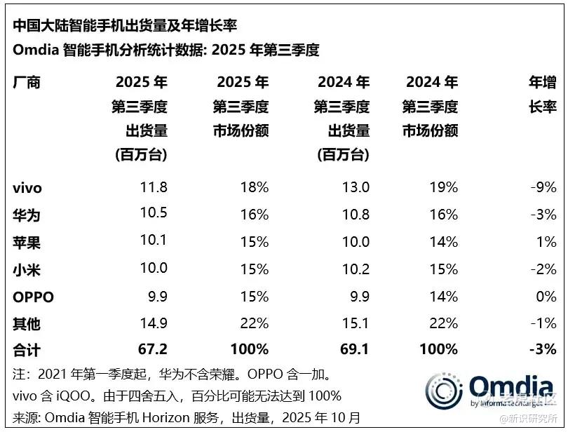 进入下半年,情况并未好转。根据Omdia在2025年第三季度发布的报告,OPPO在中国大陆市场的出货量仅为990万台,排名已跌至第五。
