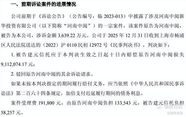 对于诉讼案件是否会对公司损益产生负面影响,建元信托表示,公司将根据法院判决结果计提相应负债,具体金额最终以会计师事务所审计确认的数据为准。