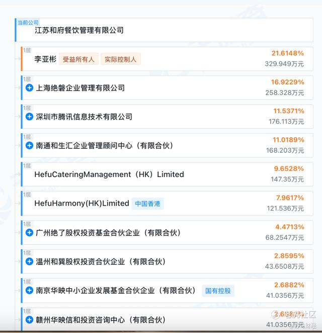 天眼查数据显示,和府捞面背后资本大佬云集,股东中包含腾讯、绝味食品、南通合生汇企业管理股份中心(有限合伙)”等多家投资机构。其中,绝味食品作为早期投资方,主要通过其全资子公司“深圳网聚投资有限责任公司”等主体进行投资,虽经部分减持,目前仍为和府捞面的重要股东之一,占股约4.47%;腾讯同样在和府捞面股东之列,占股约11.54%。