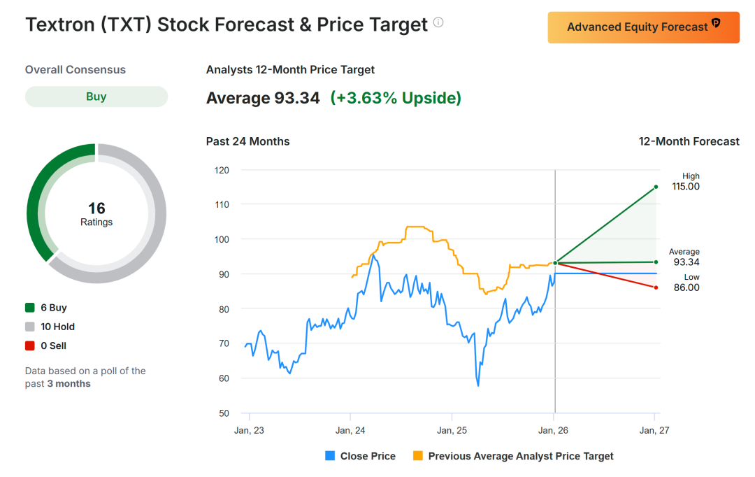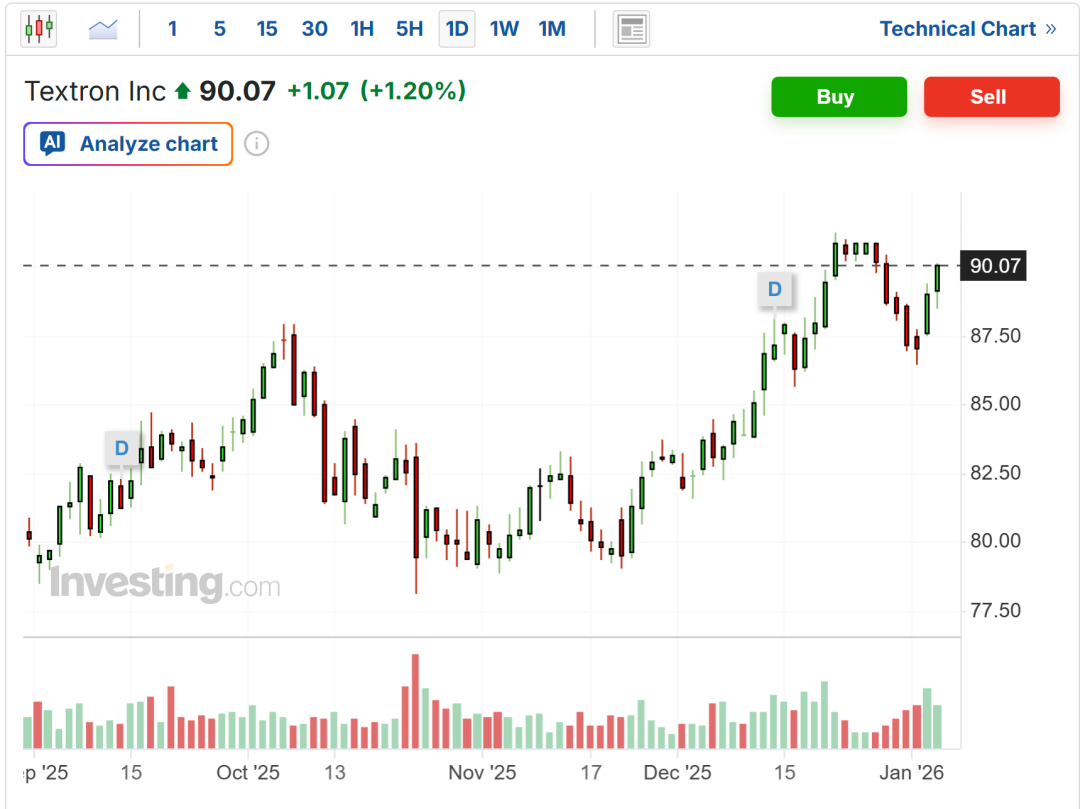 该股价格约为90美元,市值159亿美元。作为顶级价值股,TXT 获得买入评级。分析师预测其2026年目标价高达115美元,潜在上涨空间达28%。