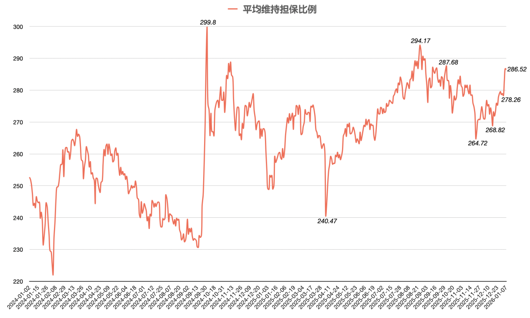 有小伙伴跟我说,两市平均维持担保比例已经飙到286%了。从历史数据看,285%以上确实不低了,换过去基本就是阶段顶部了。但去年年中开始,A股走出了一波慢牛,从3300慢悠悠的涨到了4000,两市平均维持担保比例也稳步抬升,近半年大部分时间都维持在270%以上的相对高位,与之前的急涨、冲高是有区别的。所以我们给今年定下的减仓目标是290~295%,还有一段距离。