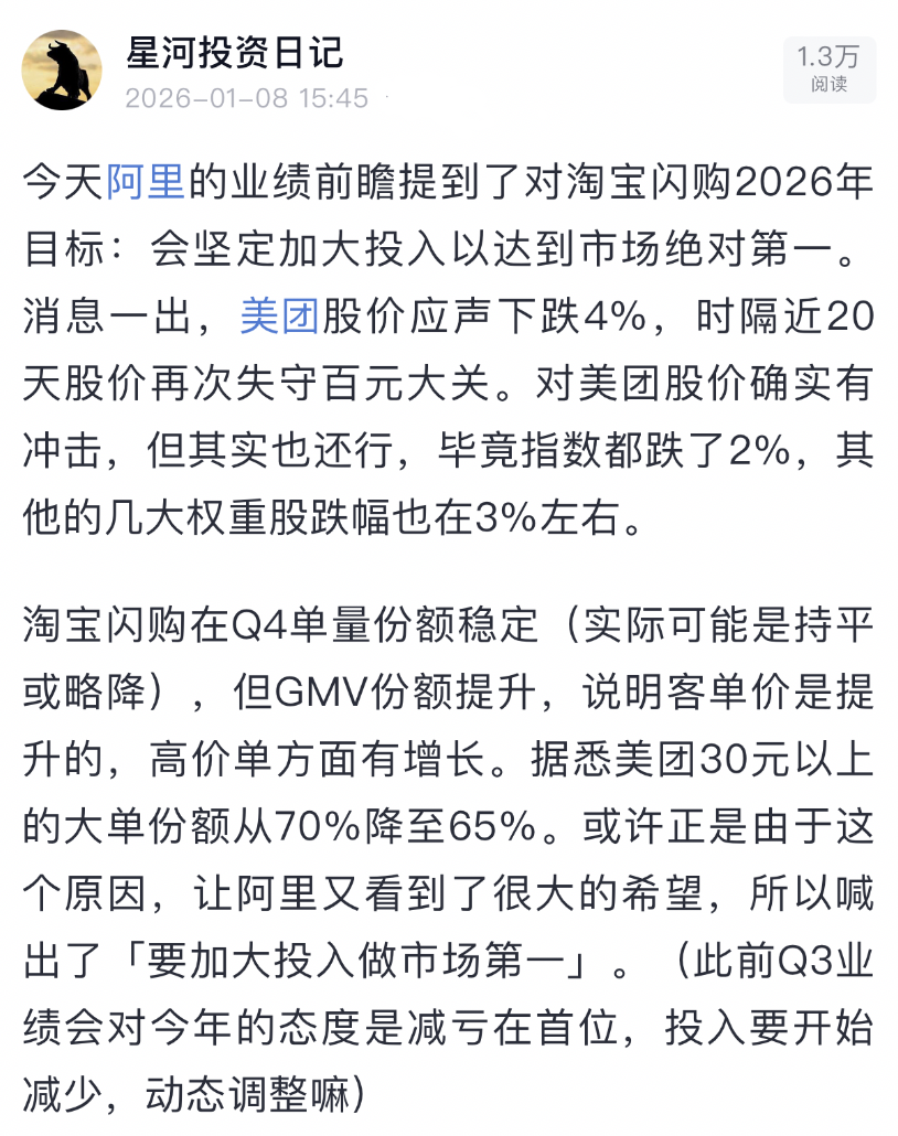 还是之前的观点,去年砸了六七百亿,电商究竟又有多少协同作用?对一个年利润只有四百亿的外卖市场,今年再砸上六七百亿或更多,真的值得吗?只不过去年已经投了那么多,抢到了这些份额,不可能随便放弃,而最近高价单的提高又重燃了希望,加上老板的力挺......
