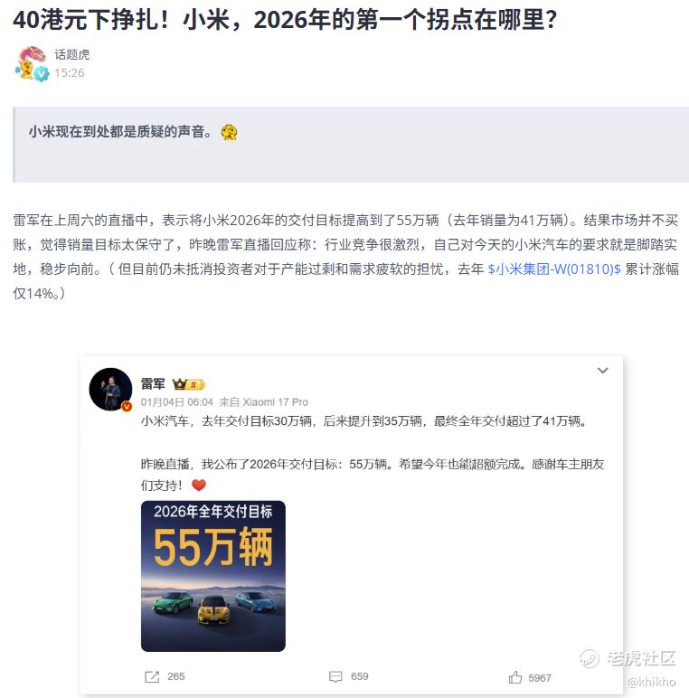 我们新手小白们,要怎么去看懂“2026 年小米汽车第一个拐点”到底意味着什么,值不值得掏出真金白银,以及如果决定上车,该在什么位置系安全带呢? 话题虎老师特意开了一个帖子,让大家来一起讨论,多空双方各有自己的理由,哈哈。