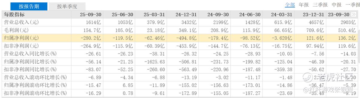 销售情况2025年目前来看是不甚乐观,2026年是否会有改善目前还不好说。财务状况杠杆游戏就不多说了,看下表东方财富统计的数据一目了然,一个字:亏。