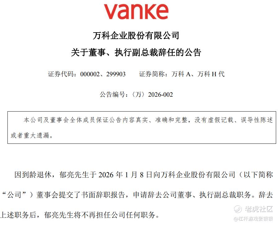 1月8日晚间,万科发布公告称,因到龄退休,郁亮于2026年1月8日向万科企业股份有限公司董事会提交了书面辞职报告,申请辞去公司董事、执行副总裁职务。辞去上述职务后,郁亮将不再担任公司任何职务。