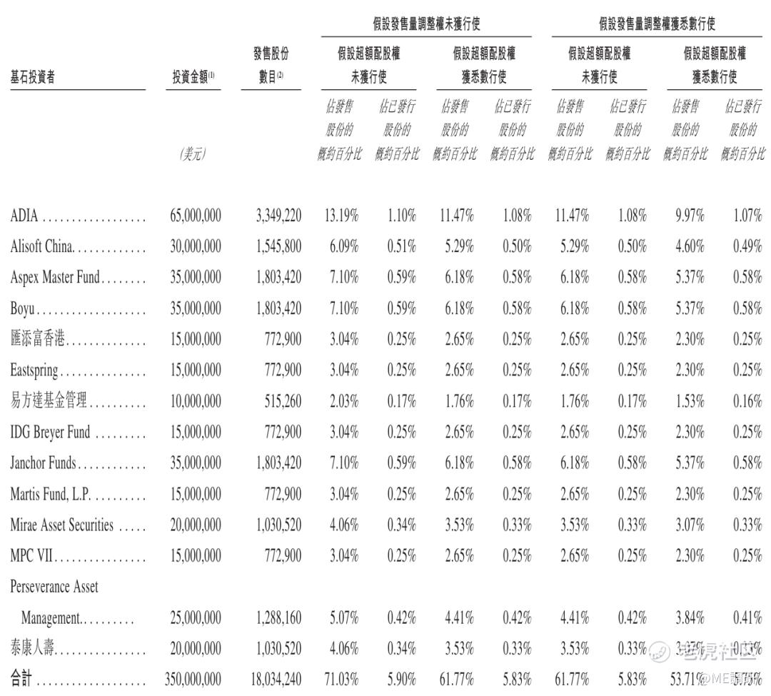 其中,阿布扎比旗下ADIA认购6500万美元,阿里旗下AlisoftChina认购3000万美元,AspexMasterFund、Boyu(博裕资本)分别认购3500万美元,汇添富香港、Prudential旗下Eastspring分别认购1500万美元,易方达基金管理认购1000万美元; IDGBreyerFund认购1500万美元,JanchorFunds认购3500万美元,EricLi旗下MartisFund认购1500万美元,MiraeAssetSecurities认购2000万美元,MPCVII认购1500万美元,PerseveranceAssetManagement认购2500万美元,泰康人寿认购2000万美元。