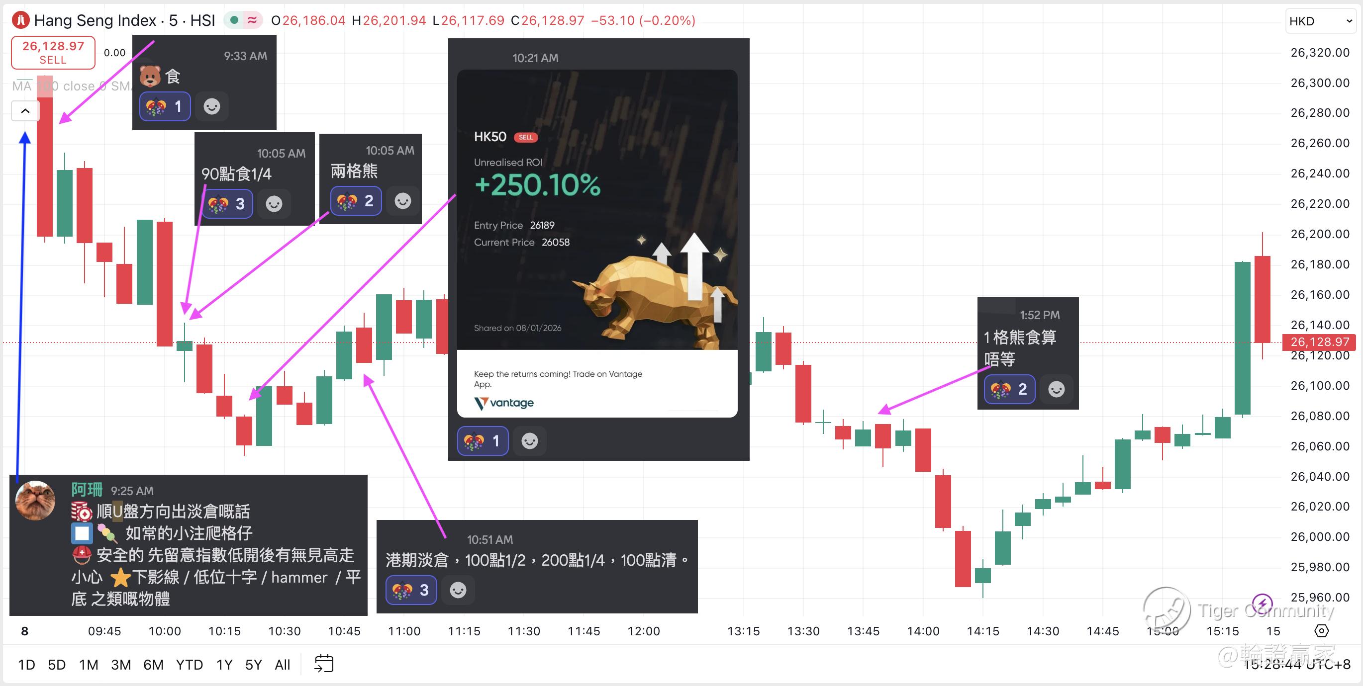 10点前终于见到指数向下回落到五分钟图10线有似企住,26200点有失守过但都算快重新守得返上去,所以作战室都等咗大约20分钟先至开出今日嘅第一注货;又唔系同人比赛,怕咩等?!最紧要正数。
