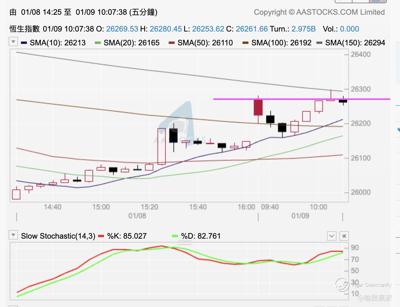 喺作战室收市之后都会同大家做个覆盘,顺便睇一睇收市后出嚟嘅图,睇下有无咩可以Mark定先。㖊日就Mark定咗个小时图,因为尾二嗰支烛喺保历加底线上出「十字星」,刚好Slow STC(14.3)亦有见触底上。