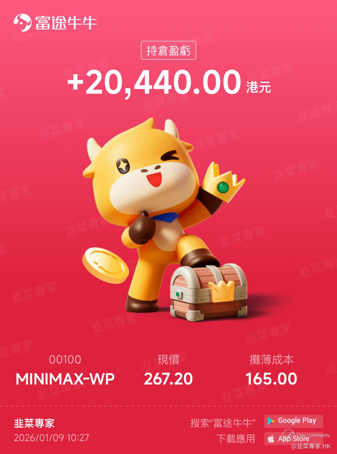 $MINIMAX-WP(00100)$ 成副身家用来抽新股,由于智谱购买力未返回,老虎户口没钱,动用友商户口抽,又赚2万