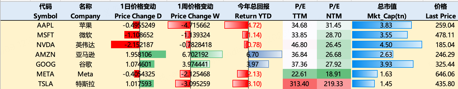大科技本周走势分化,表现不一。截止1月8日收盘,过去一周, $苹果(AAPL)$ -4.71%, $微软(MSFT)$ -1.14%, $英伟达(NVDA)$ -0.78%, $亚马逊(AMZN)$ +6.7%, $谷歌(GOOG)$ +3.97%, $Meta Platforms, Inc.(META)$ -2.13%, $特斯拉(TSLA)$ -3.1%。