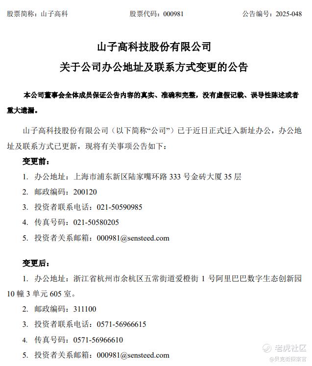 签约仪式结束的第二天,山子高科公告变更了办公地址,从上海迁移至浙江省杭州市余杭区的阿里巴巴数字生态创新园。
