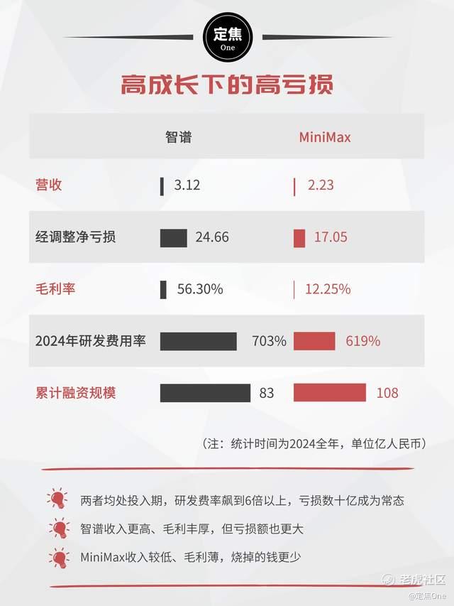 智谱走“TO B卖底座”路线,MiniMax 走“TO C做爆款”路线,目前来看,智谱营收规模更大,毛利率达50%以上,MiniMax收入规模较小,但全球化程度高。不过,两家公司均因为高额研发投入,还处于亏损状态。
