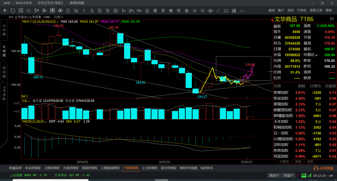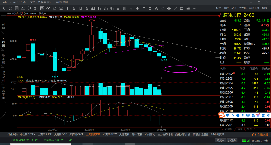 之前走的是贵金属和有色的牛市,现在是其他的商品也开始躁动了,都不跌了,有些还大幅度的反弹,这个就是信号所在了,叠加文化商品指数月线有点偏多的走势了,那么其他的商品摇动了,对于原油又该怎么布局呢。