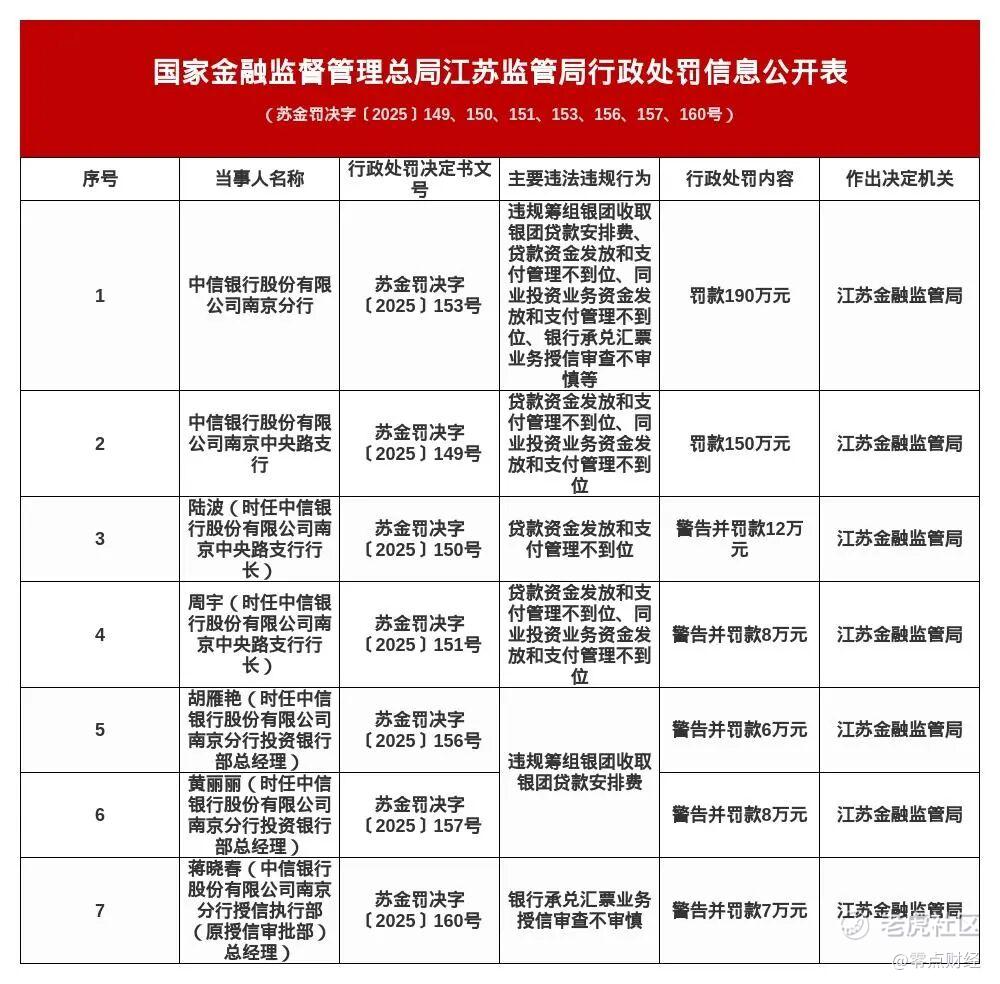 2025年12月底至2026年1月初,中信银行在江苏、陕西、山东、河北等多地分支机构接连收到罚单。
