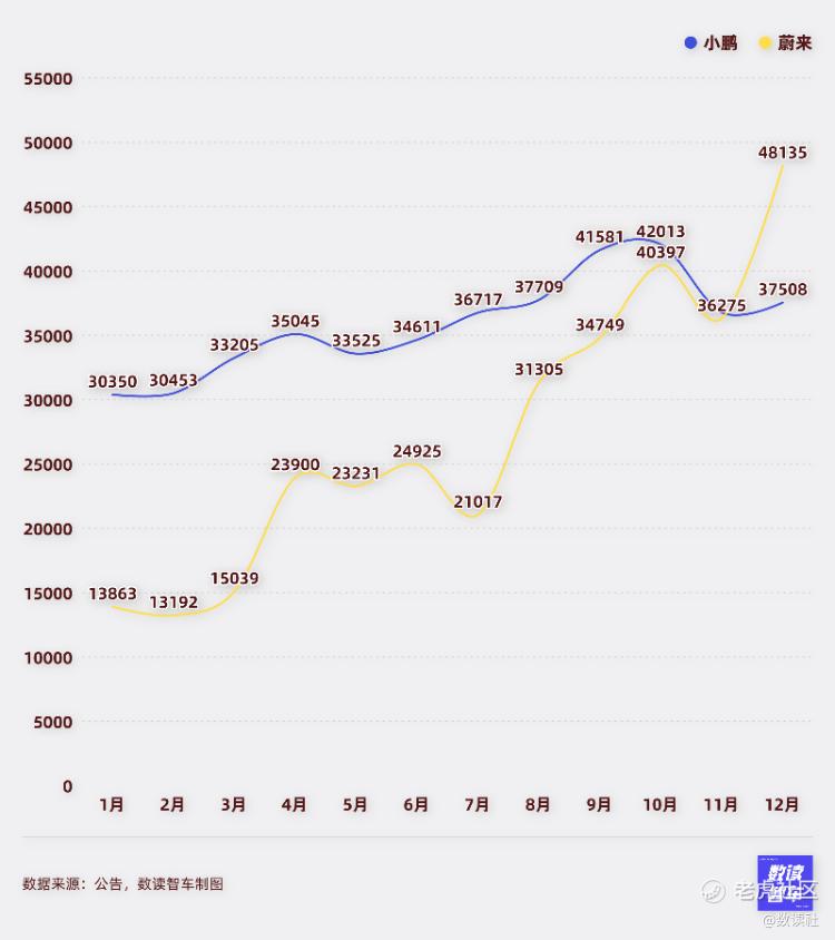 蔚来则更显挣扎,前8个月销量都不足3万台。直到第四季度,蔚来销量才真正取得成效,12月,蔚来月销量达到48135台,创造了历史新高,并且一跃成为蔚小理中销量最高的车企。值得注意的是,蔚来销量提升主要依赖的还是主力车型,其销量达到31897台,创造历史。