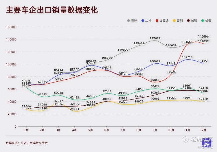 12月,奇瑞仍然是出海车企的领跑者,海外销量超过14万台,创造了新高。比亚迪紧随其后,连续两个月销量超过13万台,今年以来,比亚迪海外销量从年初的月销3万台,一路飙涨,预计2026年度有望坐上出海第一车企的宝座。