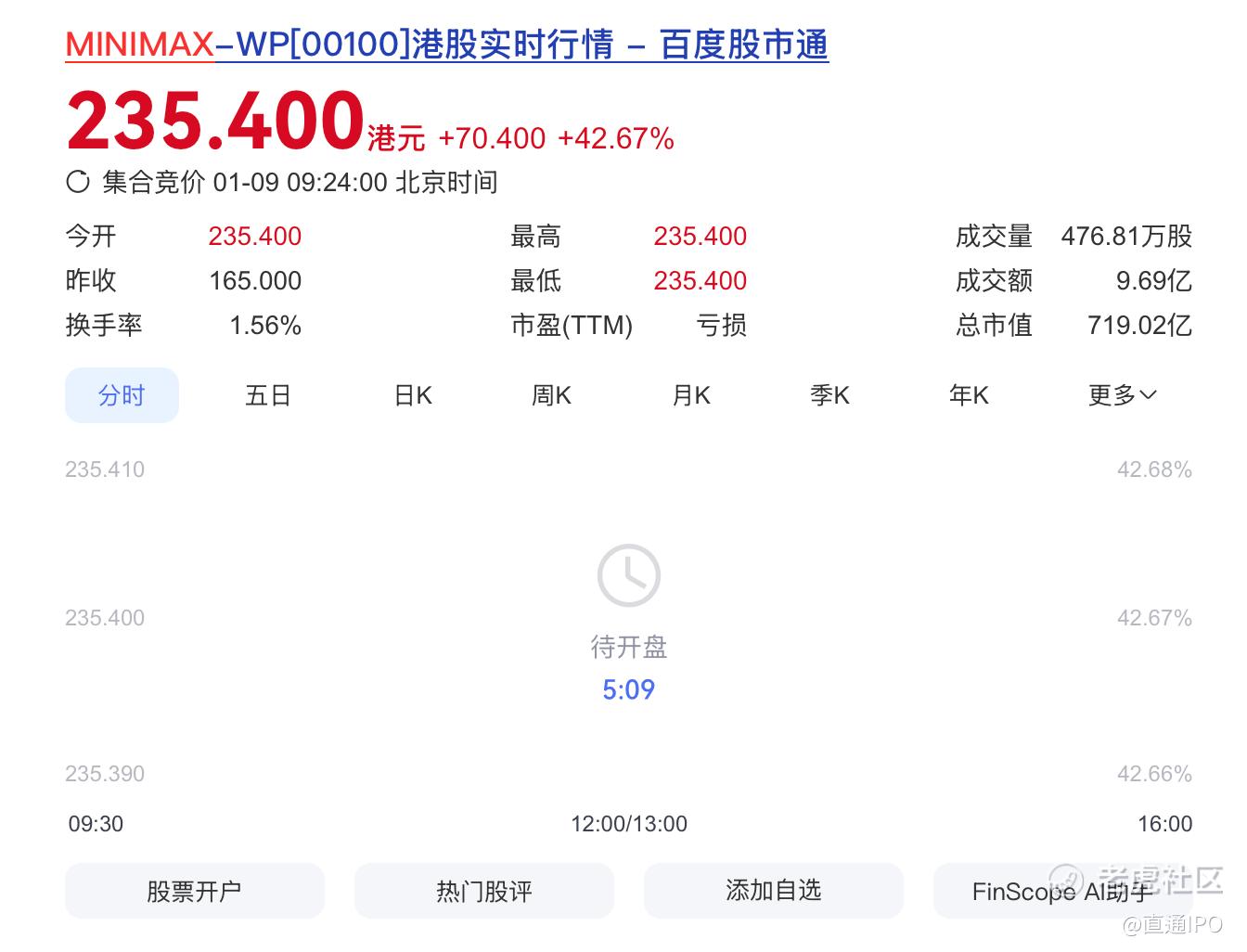 1月8日晚间,MiniMax公告将以165港元的定价上限发行,暗盘盘中一度涨超32%,收涨24.61%,报于205.60港元。