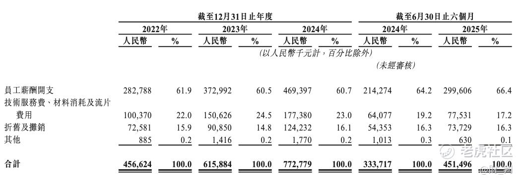 2022年至2025年上半年,天数智芯的研发费用分别为4.57亿元、6.16亿元、7.73亿元、4.51亿元,分别占同期总收入的241.1%、213.1%、143.2%、139.2%。