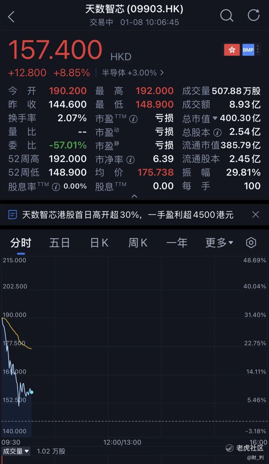发行价每股144.60港元(约合人民币129.92元),开盘价上涨31.54%至每股199.2港元(约合人民币170.9元),截至10点左右,天数智芯股价为每股157.4港元(约合人民币141.367元),市值为400.30亿港元(约合人民币359.53亿元)。