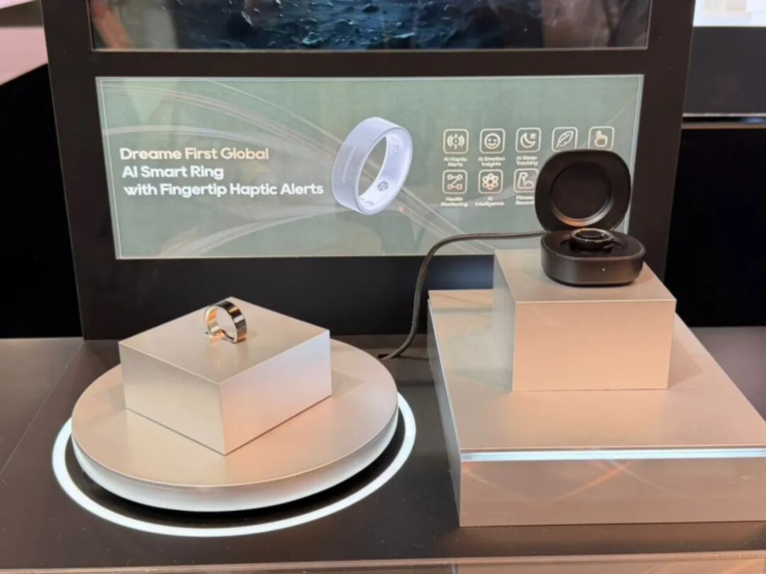 追觅在CES展出了震动AI智能戒指。它有着2.5mm的薄机身,其内置传感器可以检测心率、血氧、体温等,用来跟踪佩戴者的日常生理数据。戒指本身没有屏幕,仅通过震动向用户传达信息——包括来电提醒、闹钟提示,或在检测到健康异常时发出信号。