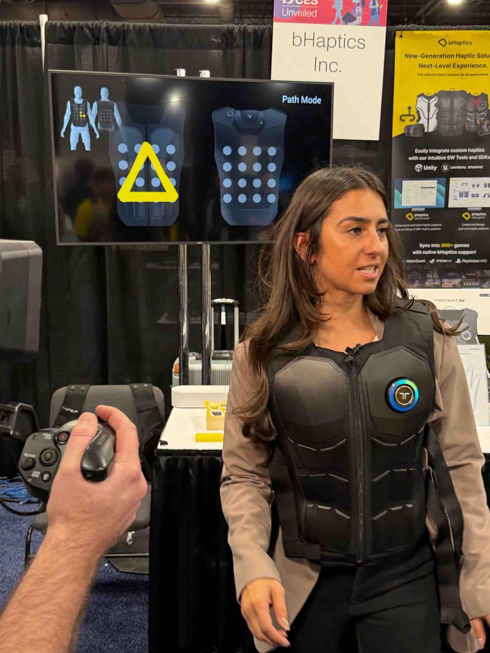 这次CES,韩国bHaptics公司就带来了一款触觉反馈马甲(haptic vest),它可以把虚拟画面和游戏中的震动、冲击“真实传到身体上”。这款可穿戴设备内置多点震动单元,可与VR/XR结合,模拟动作、冲击,将子弹方向、路径等转化成对应的震动反馈。