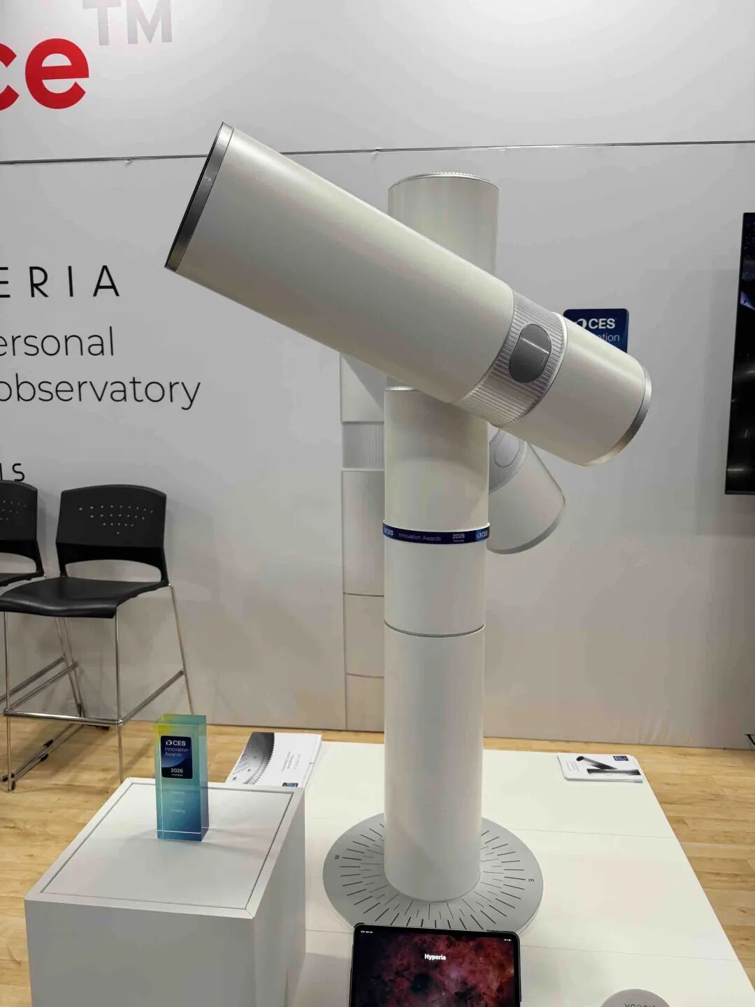 这个有点儿像“电磁炮”的东西是Hyperia智能天文望远镜,来自法国Unistellar公司。这家公司试图把“观星”从天文学家的专属工具变成大众消费品的公司。其外观被设计成一整块干净的圆柱体,看不到线缆和复杂关节,只有顶部那截略微倾斜的镜筒暗示着它的真正用途。