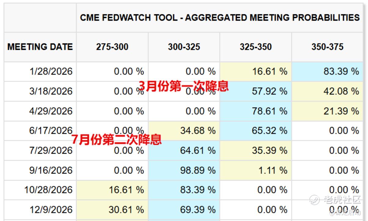 利率始终是美股市场的核心锚点。目前的预期出现明显分歧:美联储点阵图显示 2026 年仅降息一次,旨在防范通胀反弹;而 CME 的 FedWatch 工具则基于市场定价,押注全年将有两次降息。