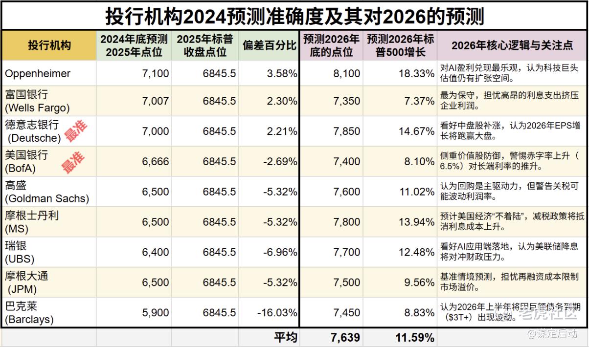 2025年底时,各大投行对2026年的行情整体偏乐观:他们给标普500的平均目标点位大约是7639,相当于较2025年12月31日的收盘水平还有约11%的上行空间。这种乐观,和他们在2024年底展望2025年时普遍偏谨慎、甚至偏保守的姿态,形成了非常鲜明的反差。