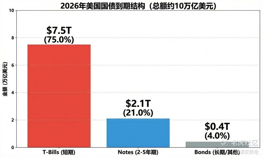 还债洪峰: 2026年约有 1/3 的公开持有美债(约 10 万亿美元) 集中到期。