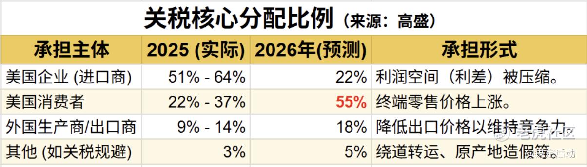 高盛的研究显示到2025年末,美国消费者承担的关税成本占比预计会升至55%,企业承担22%,外国出口商18%,其余约5%来自规避等因素。