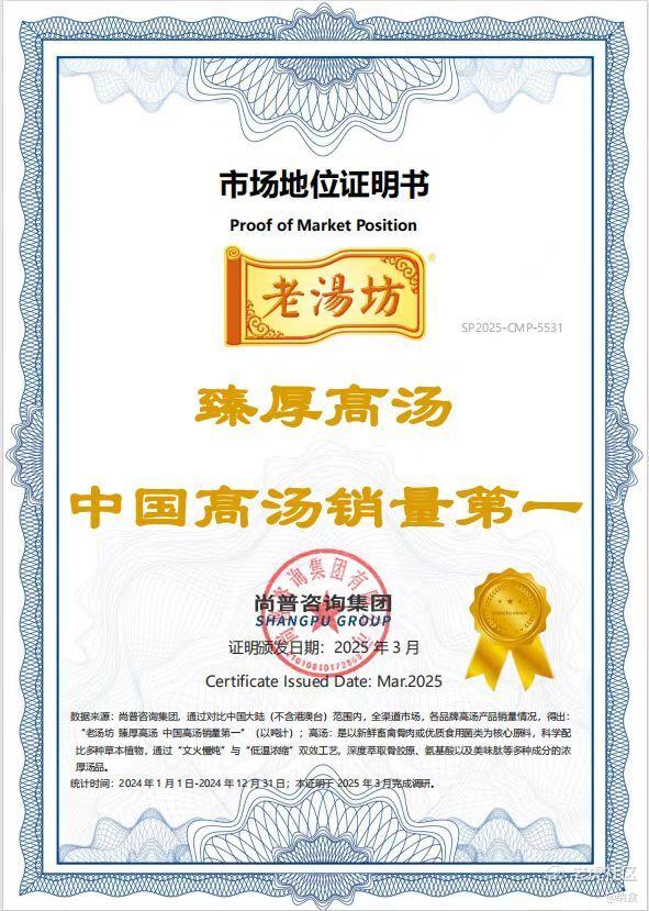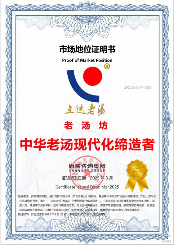 2025年3月,立达老汤荣获尚普咨询集团颁发的两项市场地位证明:“老汤坊——中华老汤现代化缔造者”与“臻厚高汤——中国高汤销量第一”,印证了其在汤品领域的领先地位。