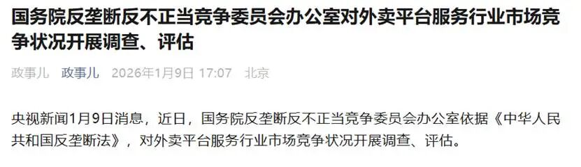 国务院反垄断反不正当竞争委员会在1月9日发声,除为今年外卖市场反内卷定调外,另一潜在原因是淘宝在1月8日的交流中表达了加大投入的意向。监管层显然不愿让外卖大战再度成为2026年的主题词。