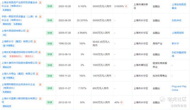 从投资的金融机构看,长宁国资在基金、小贷、担保等领域均有布局,包括上海生物医药产业股权投资基金合伙企业(有限合伙)、宇航一期股权投资基金(上海)合伙企业(有限合伙)、上海东虹桥融资担保、上海长宁国智小额贷款股份有限公司、上海科创母基金三期等都有其参股的身影。